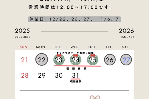 12/23~25 クリスマスケーキお引き渡し期間の営業について(2025.12.20)